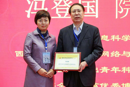 西电通院书记李赞为冯登国院长(右)颁发西电密码研究中心学术委员会主任铭牌